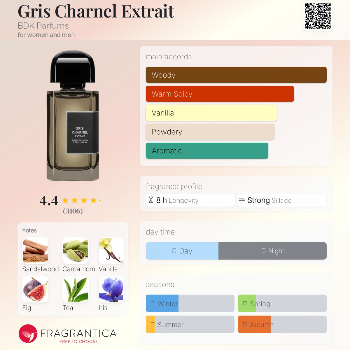 Key notes: Cardamom, Fig, Black Tea; Iris, Vetiver; Sandalwood, Tonka Bean
