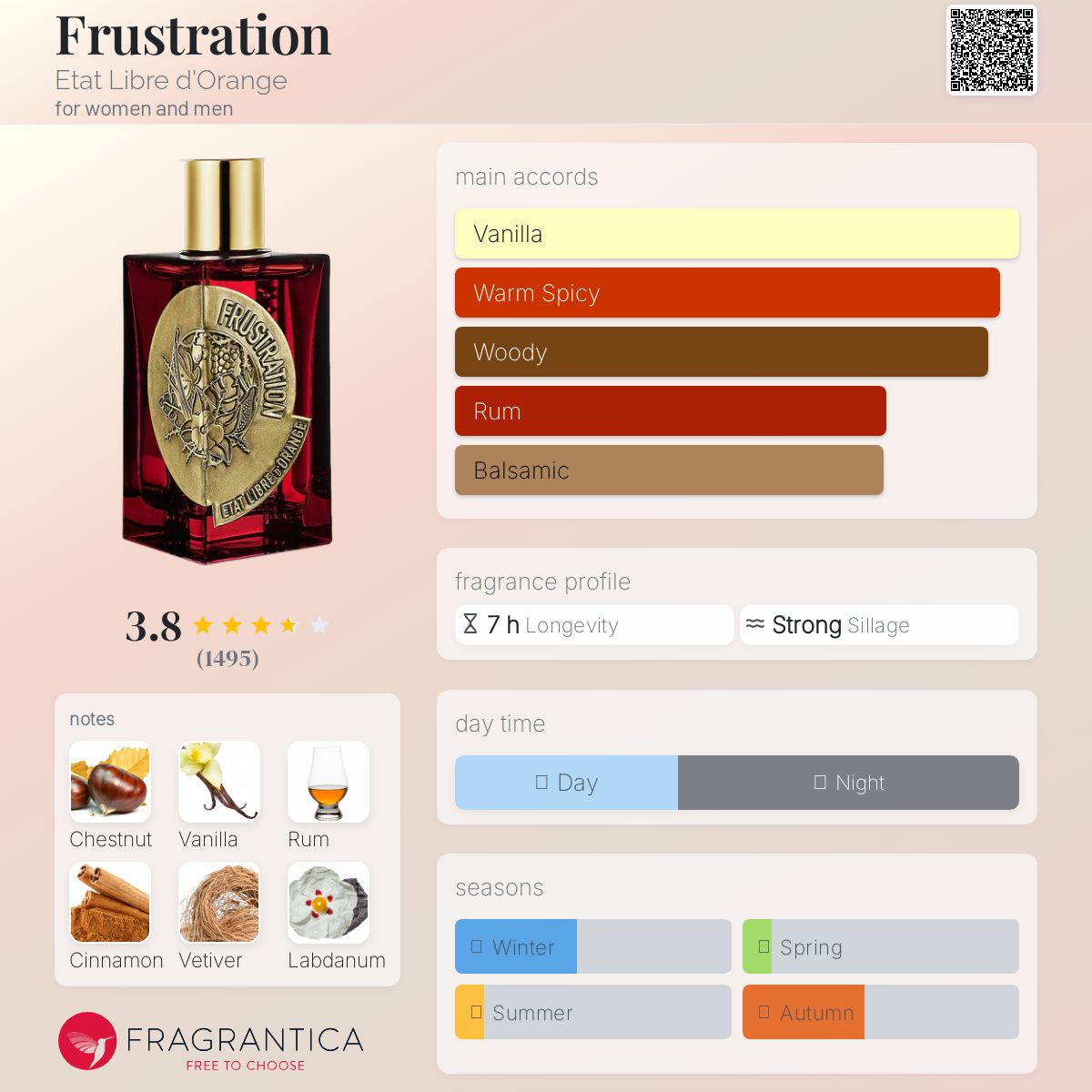 A dark, addictive gourmand built around boozy vanilla and roasted chestnut. Frustration swirls rum, spices and woods into a thick, mouthwatering amber cloud.